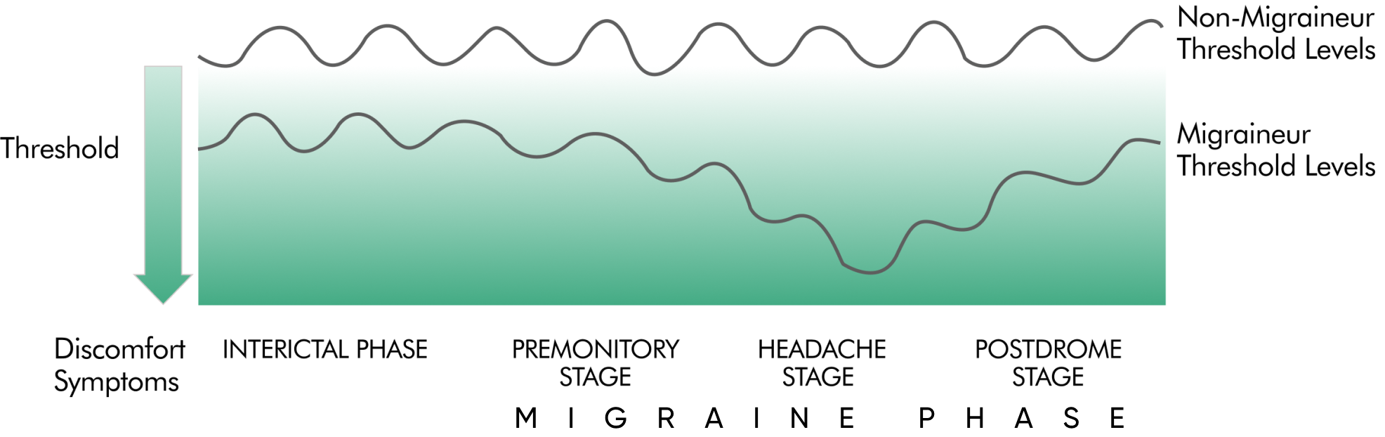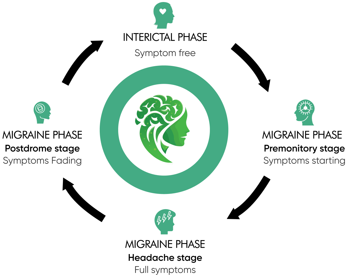 Migraine is not just a bad headache: it is a cyclical neurological condition with distinct phases. During the symptom-free (interictal) phase, migraineurs have virtually no symptoms. The symptomatic or migraine phase has three stages: when symptoms start (premonitory stage), peak (headache stage), and wane (postdrome stage). In addition, some but not all migraineurs also experience aura. Different support is necessary during the different phases.